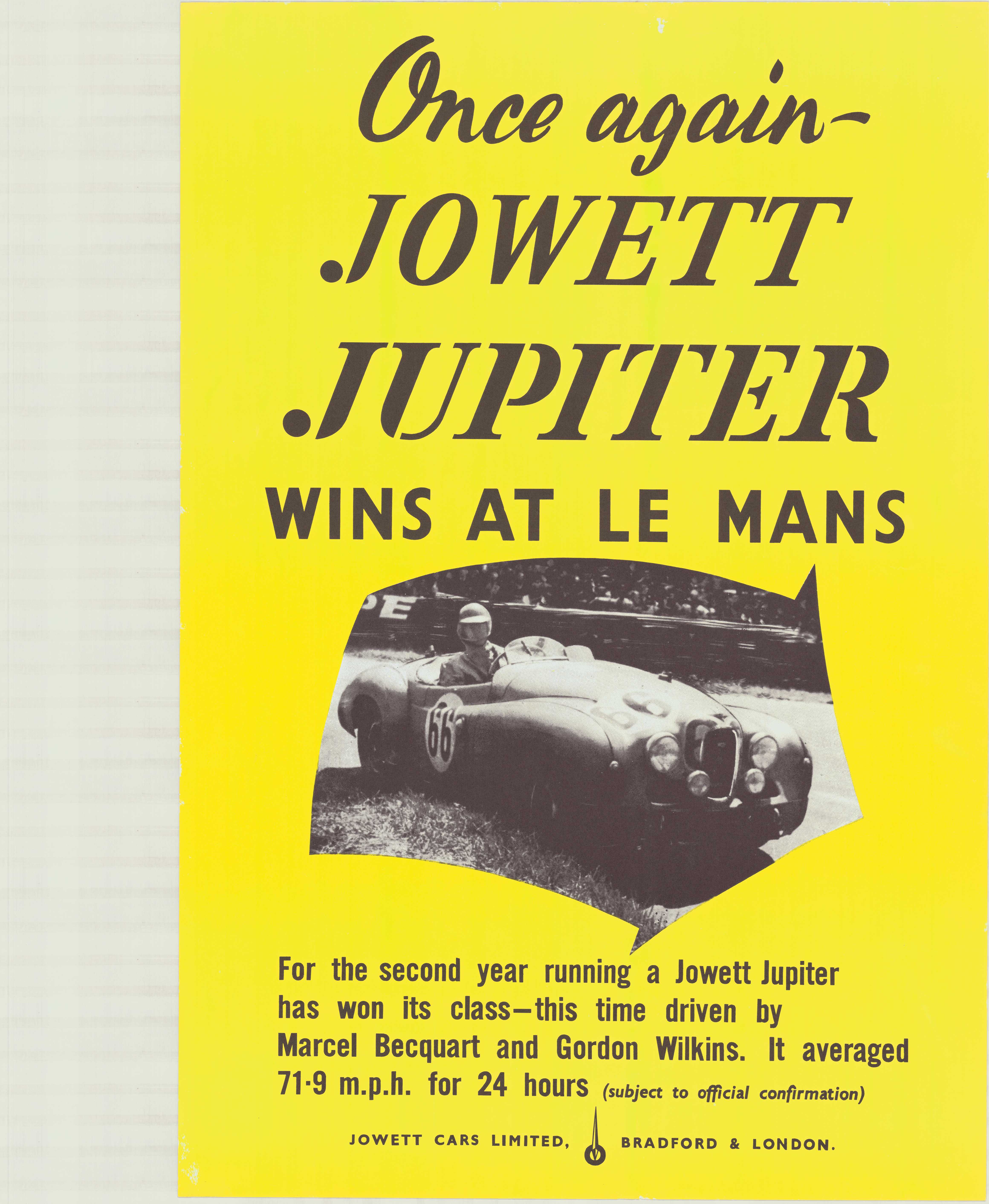 | Beskrivelse: | For andet år i træk har en Jowett Jupiter vundet sin klasse - denne gang kørtaf Marcel Becquart og Gorden Wilkins. Den gennemsnitlige 111-15 km/t 24 timer (med forbehold for officiel bekræftelse) |