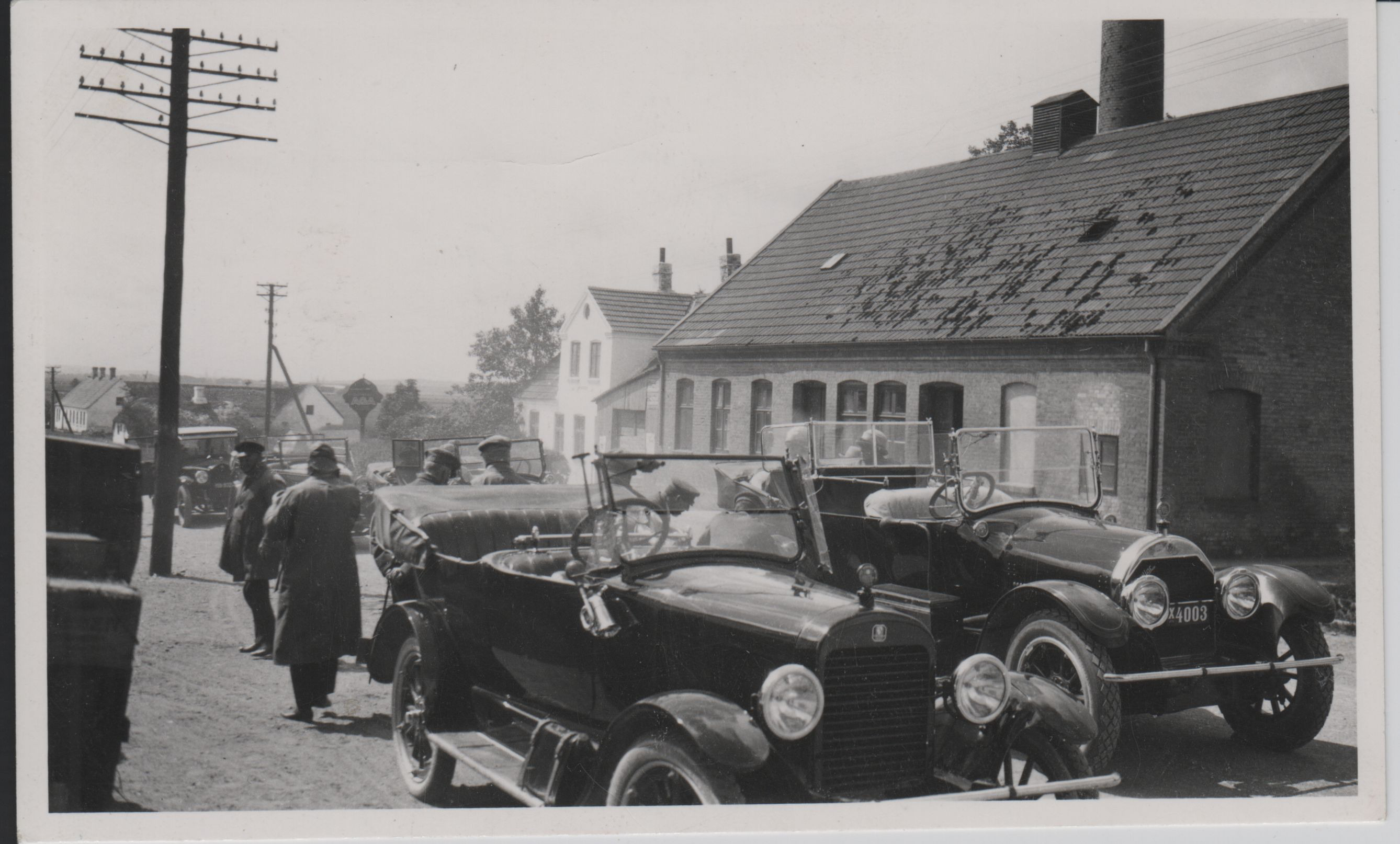 | Beskrivelse: | Jydsk Telefons direktionsvogn, X 4003, var en 8-cylindret Cadillac 1922 (bilen med blank køler). Den fik senere et lukket karrosseri. Ukendt bil til højre. |