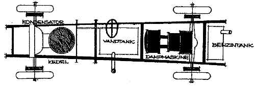 forespørgsler at burde bringe blemer og daarligt rygte. Brandfaren formente dampbilerne adgang til offentlige garager og færger, og faren for kedeleksplosion ved sammenstød gjorde dem dyre at forsikre. Yderligere maatte man vente nogle minutter ved koldstart paa tilstrækkeligt damp- tryk, samtidig med at de smaa, hurtigt opfyrede kedler vanske- ligt kunne levere damp til de høje gennemsnitshastigheder, som dampmaskinen virkelig kunne yde. I England rejste der sig i trediverne en diskussion om, hvorvidt dampbilerne burde bringes tilbage paa markedet, og i den anledning beretter en ejer af een af de sidste dampbiler, en DOBLE fra ca. 1925, nøgternt om sin vogn. Vognens ydre minder ganske om en benzinmotordrevet bils, men motorrummet optages af kedlen og fyringsaggregatet, og køler- en fungerer som kondensator. Under førersædet ligger en vandtank imellem chassisvangerne,og den tocylindrede dampmaskine ligger ligeledes horisontalt i chassiset og trækker baghjulene gennem et reduktionsgear. Brændselstanken er normalt placeret.