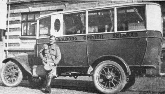 I den følgende tid var omnibilen i fart fra kl. 7:35 til kl. 24:00, så der var ikke noget at sige til, at Svend Larsen ikke magtede opgaven alene. Imidlertid havde automobilforhandler Mikkel Andersen bragt Svend Larsen i forbindelse med en anden ung mand. Jens Lassen Studstrup, uddannet maskinist, der året før havde kørt udflugtsture og lign. med passagerer på ladet af en gammel lastbil og som derved også havde fået tanken om at oprette en omnibilrute i Ålborg. Det siges, at en medvirkende årsag var, at hans forlovede, Esther Glorup, boede i Vejgård, og afstanden ville jo nok synes lidt mindre, hvis der var en busrute derud. Han indskød derfor sin arbejdskraft i selskabet ved foruden at køre om dagen også at reparere bus om natten. GMC'en havde nemlig tillagt sig den kedelige vane ofte at knække bagaksler og da der ikke kunne skaffes nye, måtte Jens Lassen selv reparere dem foruden en mængde andre dele, der ikke kunne holde til kørslen med fast gummi på baghjulene. Man må huske på at de fleste gader var brolagte, så i 1922 blev GMC'en da også forsynet med tvilling-luft- J. L. Studstrup foran selskabets vogn nr. 2, GMC 1920. Billedet er taget foran hjem- met på. Kastetvej. |