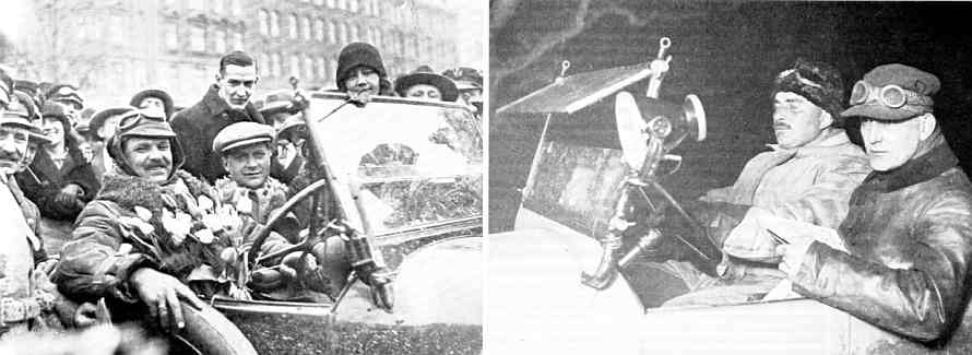 Jeg synes disse to billeder giver lidt fornemmelse af hvor barske tyvernes bivejsløb var. Man kørte ikke omkring i en opvarmet dagligstue som ved vore dages orienteringsløb. Til venstre er det FlAT-Hansen med sin observatør i mange løb Walthers Schmidt, til højre A. P. Svendsen med Lundsttøm som kortlæser. Begge i 501. |