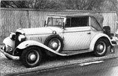 Venstre: Jan Lund-Jørgensens 1932 cabriolet før restaureringen begyndte, l dørene står „Bühne, Berlin", antagelig er karrosseriet derfra, eller også har en dansk fabrik (Højer?) fået dele fra Bühne. |