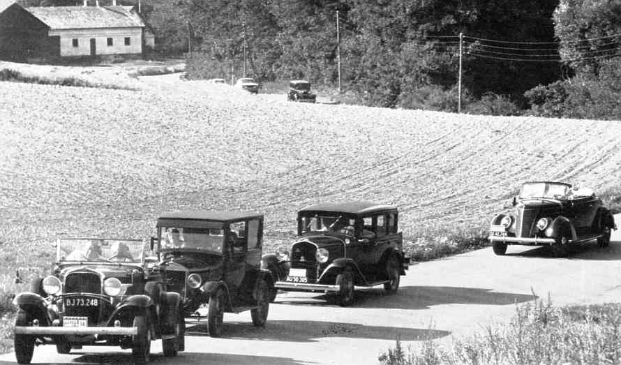 1926 Tudor, formand Dråbys DeSoto 1931 og bagest Erik Juel Christensens Ford V8 1937 cabriolet. |