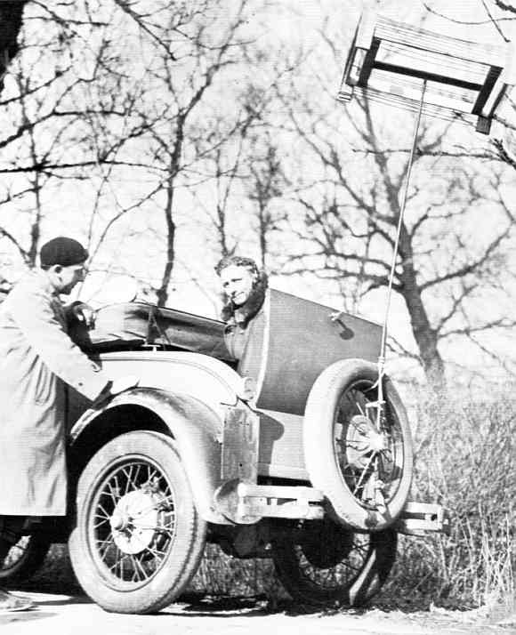 1928-29 Ford A roadster med høj antenne. Personerne ubekendte.
