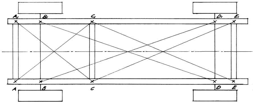 flyttes. De på gulvet nedfældede punkter udmåles. (Se skitse). Først måles afstanden mellem første og tredje punkt (A-C) og derefter mellem andet og fjerde punkt (B-D) osv. Tilsvarende længder skal for hver af vangerne være lige lange. Unøjagtigheder indikerer deformation. Herefter foretages krydsmålingen (diagonalt) f.eks. (A-Cl), (A1-C), (B-Dl), (B1-D) osv. Ved krydsmåling |