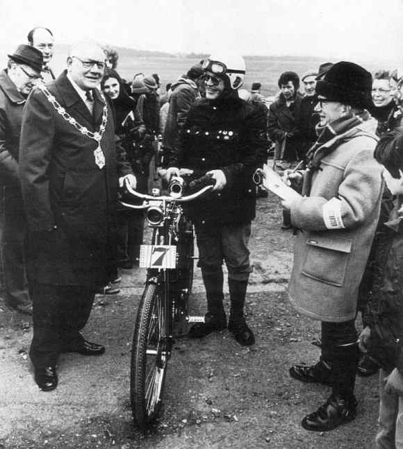 der har et skrin af guld hvori hun gemmer de æbler som guderne skal bide i når de ældes. Så fyldes de atter med ungdom. Er Fafnir kendt i både den germanske og den nordiske gudeverden er Idun ukendt i den germanske mytologi ifølge Encyclopedia Britanica. Tyder dette derfor på dansk oprindelse, og er teksten på skiltet på tysk af hensyn til snobeffekten? Motorcyklen Jduna er yderst professionelt lavet, både helhedsindtrykket og alle deltaljer viser at der ikke er tale om tilfældigt husflidsarbejde begrænset af teknisk kunnen eller kapacitet; på de 5 dele til forbremsen er der indhugget tallet 19 hvoraf man må kunne slutte, at der i hvert fald har været tale om en lille serieproduktion. Det er mit indtryk at de hjemlige arkæologer på motoriseringens område forlænget har fastlagt alle bevægelser omkring århundredskiftet, så dansk oprindelse er vel næppe sandsynligt. Jeg har ved den senere adskil- Det 43. Epsom-to-Brigklon Run. Lord Mayor og starter i aktion ved afgangen fra Epsom. Jduna bar på dette tidspunkt højst tilbagelagt 10 km siden restaureringens afslutning. |