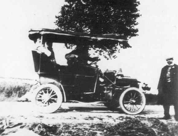 Poul Christensens rødbrune Rambler »with a fringe on top«. Foran vognen red. Ringer, en af de tidligste forfattere og udgivere af bilblade og bøger. Foto venligst fra Poul Christensens datter, Karen Måre. før vognen væltede og af den stærke fremdrift