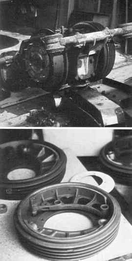 Bagtøjet med kobling, gearkasse, differentiale, bremsetromler og tracta-led er en ordentlig klump. En varm og solrig dag i maj '79 afmonterede jeg det og begyndte at skille det ad. i motorløb. Fra sin tid som fabrikskører for Fiat vidste Vincenzo Lancia hvordan løbsdeltagelse stjal alle de gode teknikere fra produktionsafdelingerne. Fabrikken var i 1951 stadig et familieforetagende, så for ikke at provokere familiens øvrige medlemmer lod Gianni Lancia og Vittorio Jano den nye coupe bygge hos Pinin Faring og kun i 50 eksemplarer. Antallet afslører imidlertid også hensigten. 50 var minimumsproduktionstallet for vogne der skulle godkendes til sportsvogns-løb. Bremsetromlerne blev sandblæst og drejet af og derefter malet. (Det er støbestål, så malingen er et problem. Den varmebestandige, matsorte lak jeg brugte på de forreste tromler ser ikke ud til at kunne tåle vand. Den blanke på bagbremserne klarer dig bedre.) Det er nogle velvoksne bremser. Diameteren er 300 mm foran og 280 mm bagtil, bredden henholdsvis 78 og 73 mm. |