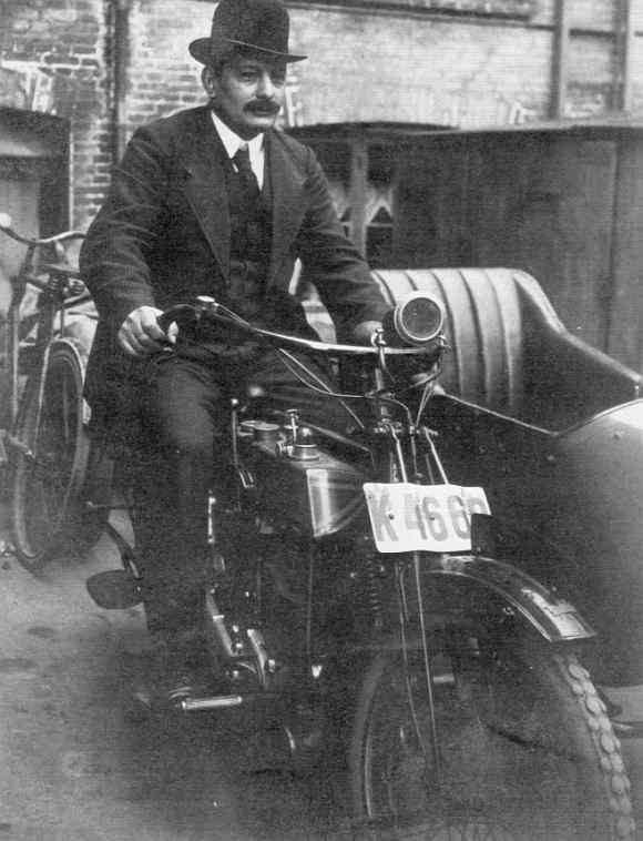 På motorcykler sad fornummerpladen på tværsi begyndelsen, og at det ikke var af sikkerhedsgrunde ses her, for myndighederne havde ikke noget imod at den engelske plade på langs af forskærmen blev siddende. Cyklen er en New Hudson fra 1910-14 med mærkets importør, H. Levison, i sadlen. Foto fra Eva Reerstorp,