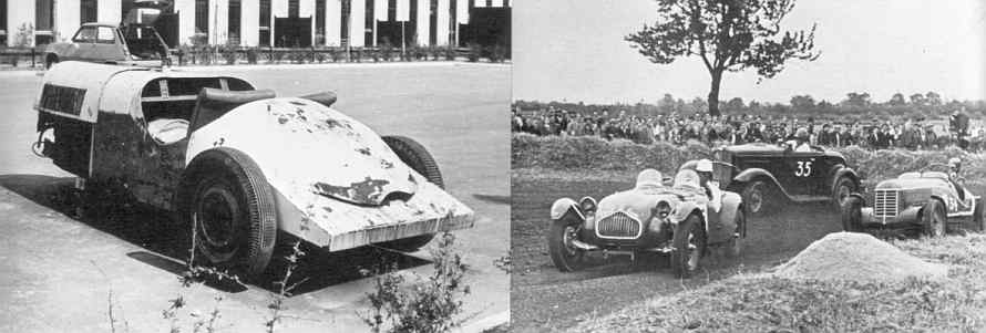 Yngve Falk har fået ny bil. Monstrumet er måske den sidste overlevende rest af en af de hjemmelavede racere, som i slutningen af 1940'erne startede i Nordisk Specialvognsklasse herhjemme og i vore broderlande. De fleste var komponeret over en Ford V8, men den her blev lavet af Sv. E. Kronsbjerg i Odense på et FIAT 1100 chassis med en Opel Kapitän motor. Forpartiet har skiftet udseende nogle gange. Det er vogn nr. 34 på billedet til højre. En kuriositet er det i hvert fald. |