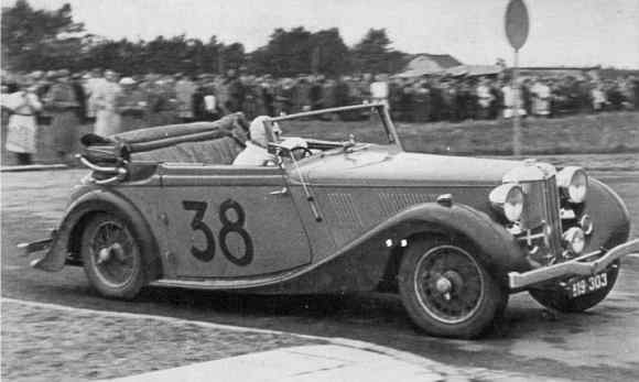 fire vogne startede ad gangen, 6 km den ene vej til rundkørslen ved Glostrup og 4 km tilbage til målet. Nellemann startede i klasse med to Opel og en Ford »4«, dvs A, og vandt selvfølgelig stort med tiden 4:47:7, svarende til ca 125 kmt. Arrangørerne påstod at have kalkuleret på forhånd, at højeste fart på den lange langside så ville være 42 procent højere. Nellemann kørte i øvrigt hurtigere, da han i et andet heat startede i sin ny TC. Malthe Bruun flyttede til Djursland. Hans søn Kjeld er medlem af DVK nu. Han mener, faderen solgte vognen omkring 1953-54. |