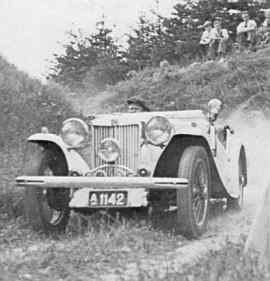 2 i 1945, 23 i 46 før importrestriktionerne kom, og 1 i hvert af årene 47, 48 og 49, i alt 28. Mange af dem gik næsten direkte ud på motorbanerne, men én bogstaveligt taget den modsatte vej. Den blev købt af færdselspolitiet, som den følgende tid fiskede mange fartsyndere med denne usandsynlige politibil. En måned eller to efter Glad fik Torben Strand sin TA og han blev snart dominerende M.G.-kører på danske og andre skandinaviske baner — 20-30 sejre og flere, Danmarksmesterskaber. Strand satte kofanger på sin TA og når fx Vilb, Nellemann strippede sin for skærme og lygter for at komme hurtigere afsted, vandt Strand med fuld oppakning. Strand ændrede farven fra blå til flødefarvet. Da han lige efter krigen fik en af de første TC, overlod han sin TA til Rotbøll Ørum, men beholdt de oppustelige sæder og lod Rottbøl få de ny massive. Til venstre Strands TA ved trial i 1939, på forsiden TC på Frederiksborg Slotssø 9/2 194 7. |