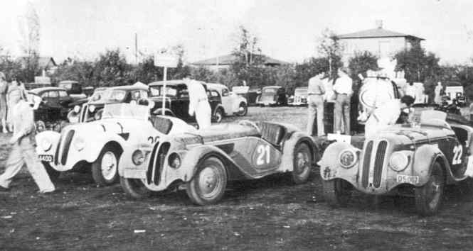 Tre BMW 328 på Amager Travbane.- Skarrings, Frede Andersens og Gunnar Wahlbergs.