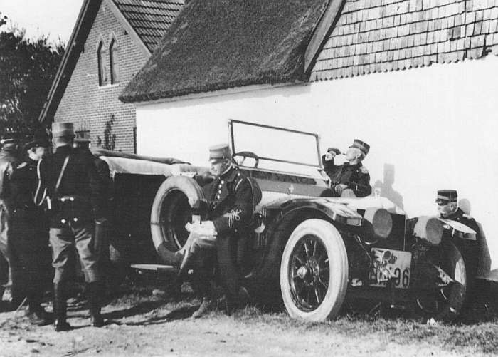 Lerche var med i det frivilligekorps der stillede biler til rådighed for det næsten billøse forsvar Billedet er fra en øvelse i 1914 og vognen er til lejligheden forsynet med HtK nummerplade (Hærens tekniske Korps). Generalstaben gør rast ved en gård på Sjælland og kongen spiser spiser sin madpakke på trinbrættet. Rørbys søn bekræfter at faderen havde en RR, men familien har ingen fotografier. Vognen kan jo have været på hastigt gennemtræk. Nathansohn var vekselerer og har ingen efterkommere. Det er i øvrigt ganske forbavsende, så mange af de RR-ejende familier, der er forsvundet fra jordens overflade. 1359Det var en Barker laudaulet på langt chassis, leveret