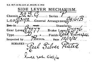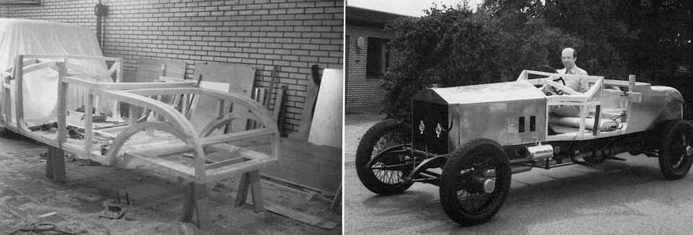 brugt til en anden bil (der ikke mere er i landet). Kølerfigur, de fleste instrumenter, karburatordele, spole, motorluftpumpe til benzin, termostat, forlygteholdere, parkeringslygter, Klaxon horn og meget, meget andet manglede. Så nu gik jagten på disse dele overalt i verden. Rattet fandt jeg i Kapstaden, mange dele i Australien og resten i England. Motoren blev hovedrepareret, benzintanken, der var utæt som en si, svejset. Gearkasse og bagtøj var perfekte, så efter at jeg fandt den rigtige Stadier under opbygningen bos Sachmann, |