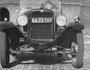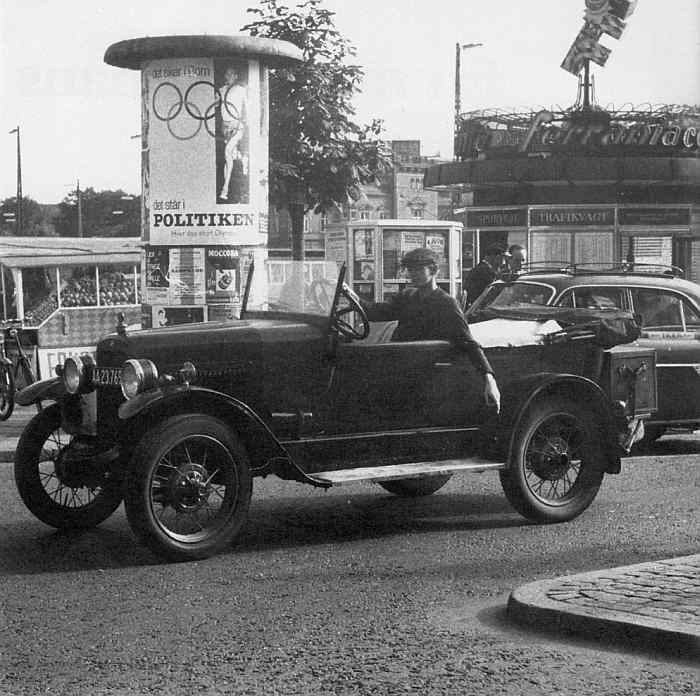 Bo Bonfils' trekantede hoved indrammet af rattet på Overland 1924. 1960.- Bo Bonfils på Rådhuspladsen i Overland fra 1924. Karrosseriet er blevet fineret. Uoriginale hjul.