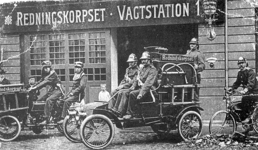 Efter påbygningen af brandudstyret så Falcks Buckboard sådan ud. Fotograferet på den første station i Ny Kongensgade i København. |