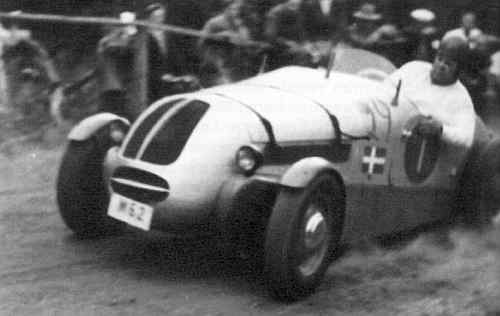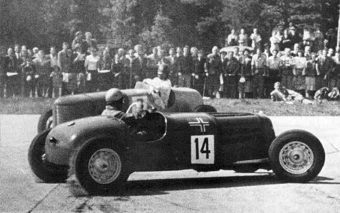 De bedste danskere deltog mange gange i løb i Norge, Sverige og Finland, her er det Morian Hansens Humber Special (bagest), som på den norske Gardermoen bane 11. juni 1950 tager en stille vals med nordmanden Erik Nyhus' Ford. Det var på samme bane, Humberen sprang over halmbarrieren så den måtte til længere tids genopbygning. 1 1951 kørtes Humberen af Louis Winther på Fangel- banen, men Morian overtog den igen og sluttede dens løbskarriere på Roskilde Ring. |