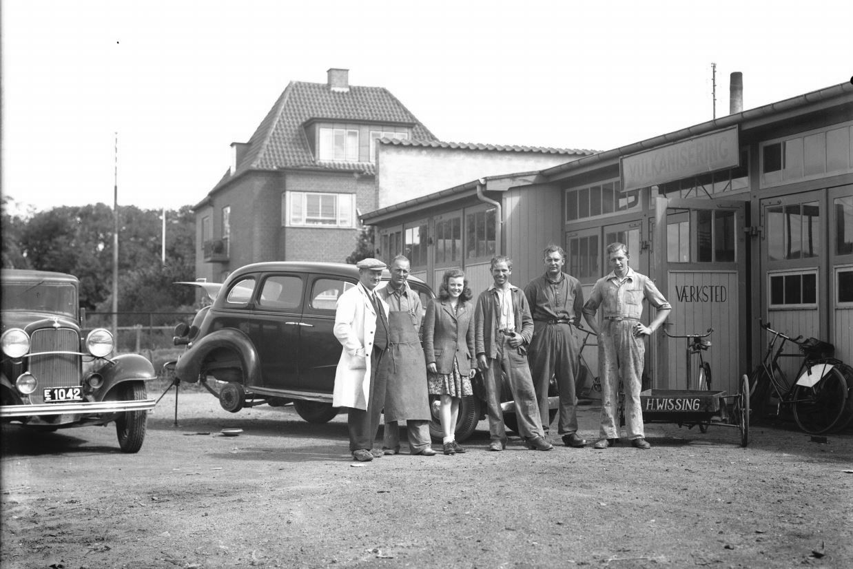| Beskrivelse: | H. Wissings vulkaniseringsværksted. Jyllandsgade 11, Ringsted. Det er Marius Knudsens Ford årg. 1933 til venstre med E1042. |